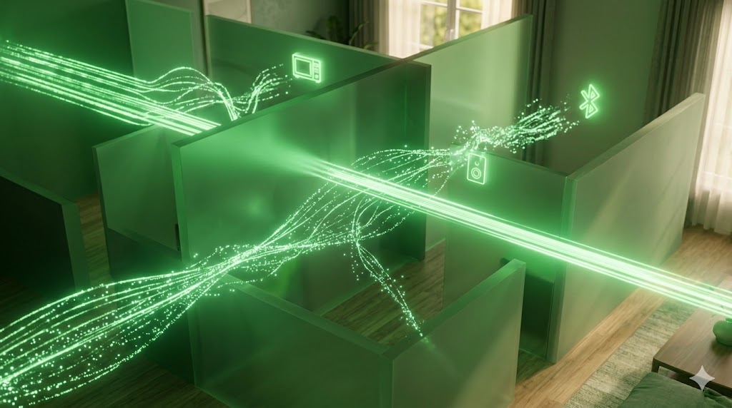 Wi‑Fi сигнал слабшає під час проходження через стіни, особливо бетонні та металеві. Дзеркала просто відсікають сигнал. Велика відстань від роутера також знижує потужність сигналу. Рішення: переміщення роутера ближче до центру, використання Wi-Fi повторювачів або mesh-системи.